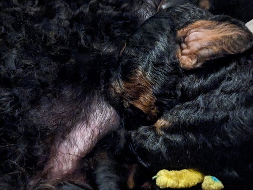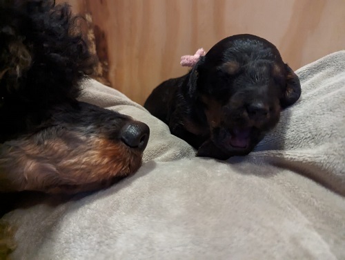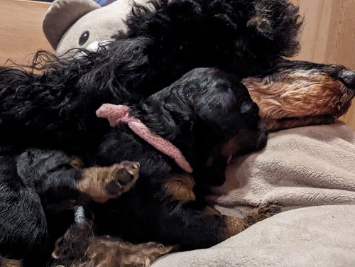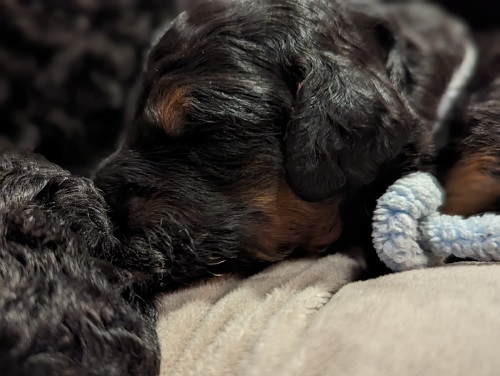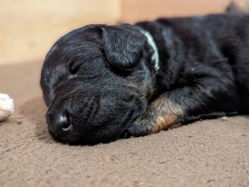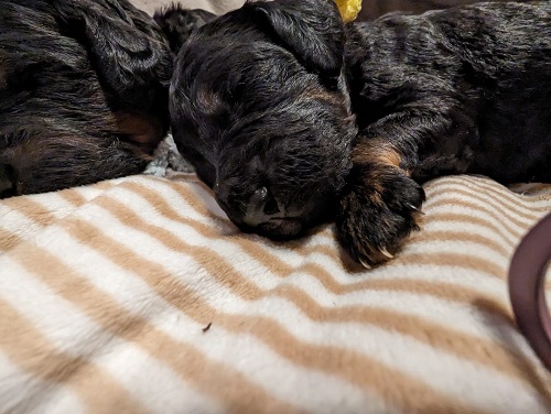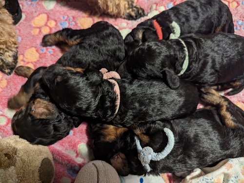Unsere Züchtereltern meinen ,man könne zugucken wie wir wachsen. Das liegt bestimmt daran das unsere Mama Sunny uns so gut versorgt. Flotte Löckchen könnte man uns auch nennen, denn ganz schön flott bewegen wir uns schon durch unsere Welpenstube. Bekommt Mama Sunny Abends ihren Quark muss Züchtermama gut aufpassensonst sitzen wir zu siebt in der Schale :-) .