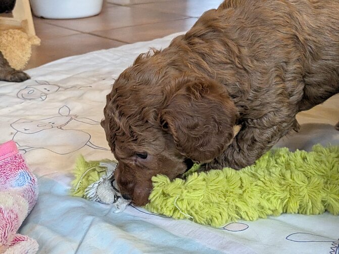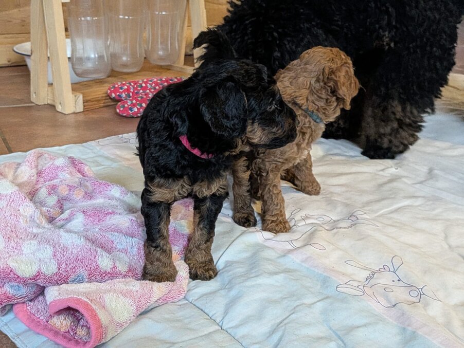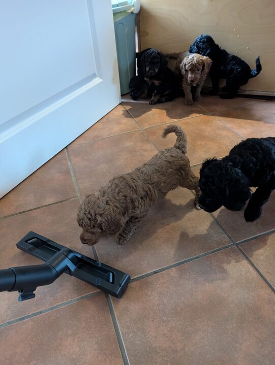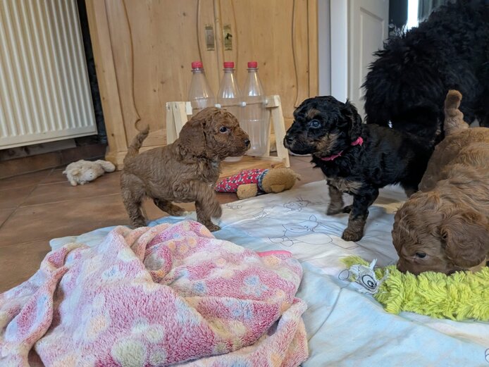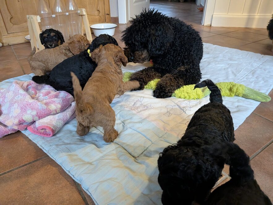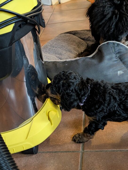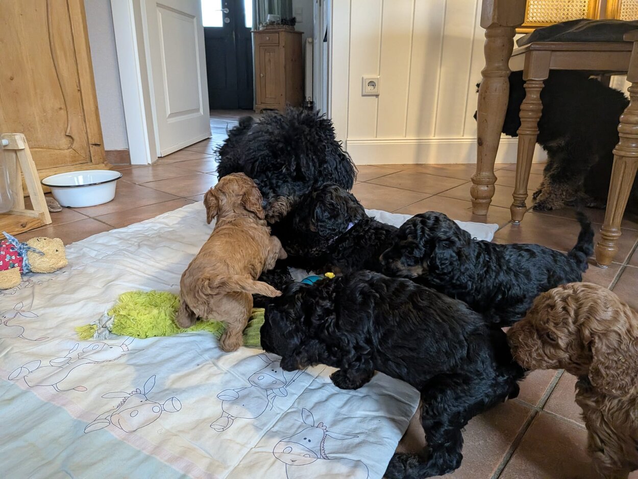 Inzwischen dürfen wir auch unsere Welpenstube verlassen und uns Raum für Raum mal ganz genau ansehen. Am Anfang haben wir mächtig "geschettert" .Alles war neu und auch viele fremde Geräusche haben wir kennengelernt.Staubsauger, Waschmaschine und vieles mehr gehört jetzt zu unseren Alltag. Zurück in der Welpenstube wird dann gemeinsam mit unseren zahlreichen Spielzeug gespielt . Am Wochenende hatten wir Besuch von unseren zukünftigen Pudeleltern.