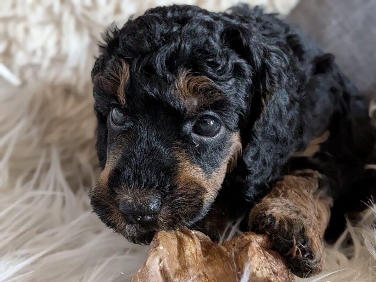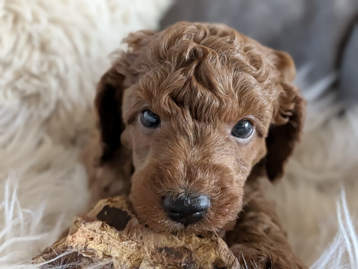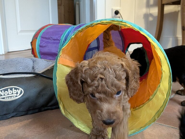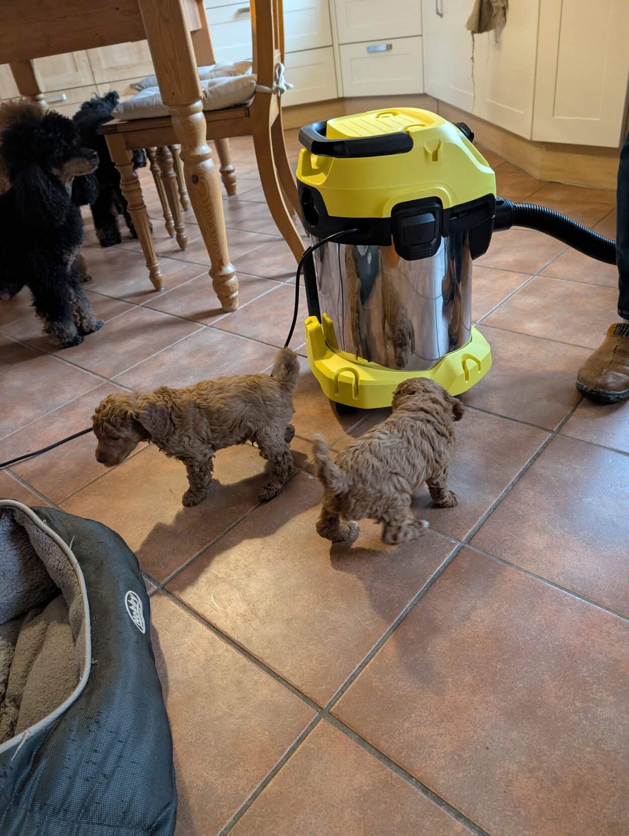 Inzwischen dürfen wir auch unsere Welpenstube verlassen und uns Raum für Raum mal ganz genau ansehen. Am Anfang haben wir mächtig "geschettert" .Alles war neu und auch viele fremde Geräusche haben wir kennengelernt.Staubsauger, Waschmaschine und vieles mehr gehört jetzt zu unseren Alltag. Zurück in der Welpenstube wird dann gemeinsam mit unseren zahlreichen Spielzeug gespielt . Am Wochenende hatten wir Besuch von unseren zukünftigen Pudeleltern.