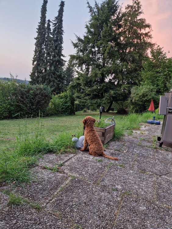 Polly diese Woche in der Hundeschule, beim Tiersendung-Schauen und beim Vögel-Beobachten. Hallo Steffi, die Woche ohne Babs ist morgen vorbei. Ich denke, ich habe ihren Teil der Polly-Betreuung zu deren vollsten Zufriedenheit übernommen. Bin ja Gott sei Dank wieder soweit fit, dass ich täglich zweimal größere Strecken mit ihr im Wald laufen kann. Habe sie gestern gewogen: ganze neun Kilo wiegt das Prachtstück inzwischen. Vielleicht haben wir einen Königspudel zum Preis eines Kleinpudels bekommen?🤣 Wir denken, dass sie inzwischen fast ausgewachsen ist. Babs geht soweit gut, sie freut sich auf morgen und lässt euch herzlich grüßen. Sie hatte im Krankenhaus Kontakt mit Jutta. Schön, dass ihr uns mit den beiden zusammengebracht habt. Wir werden mit Sicherheit öfter zusammenkommen, wenn bei ihnen wieder ein Pudel in der Familie ist. Für morgen ist alles vorbereitet; Rollstuhl und Gehbock habe ich schon abgeholt. In einigen Wochen wird Babs wieder herumspringen wie ein junges Reh. Herzliche Grüße,Polly und Günter