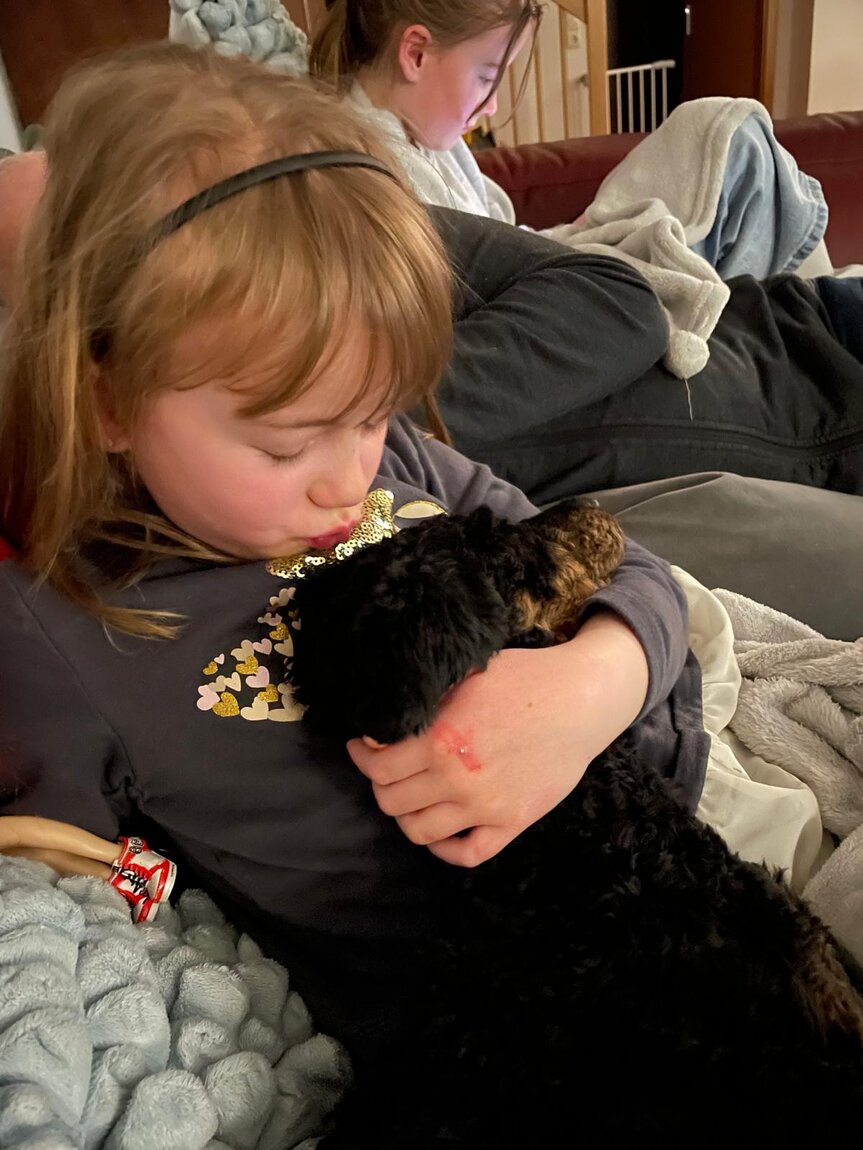Guten Morgen, wir waren gegen 2 h raus und gegen 5.30 h! Gerade hat sie etwas gespielt und jetzt schläft sie auf meinem Schoß und ich trinke einen Kaffee auf dem Boden und versuche richtig wach zu werden 😬😘