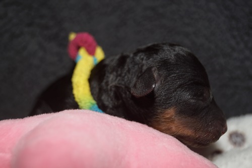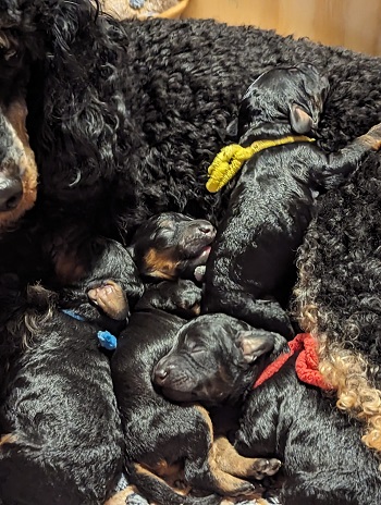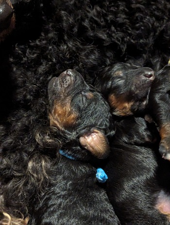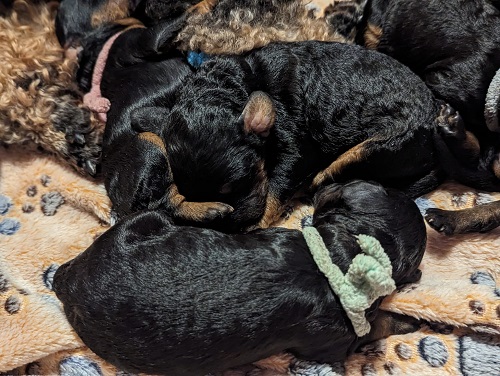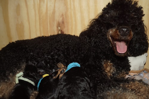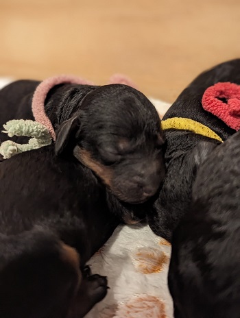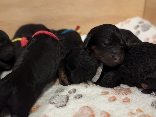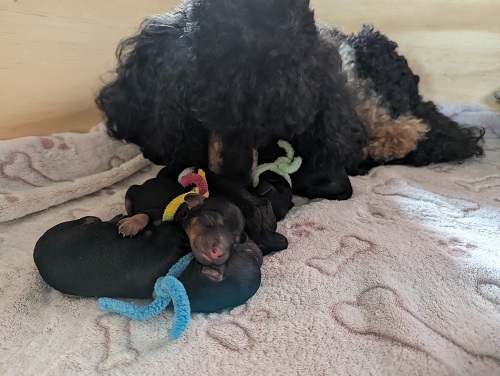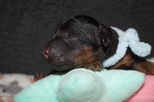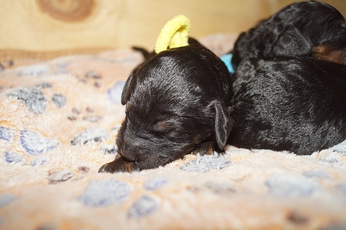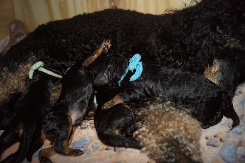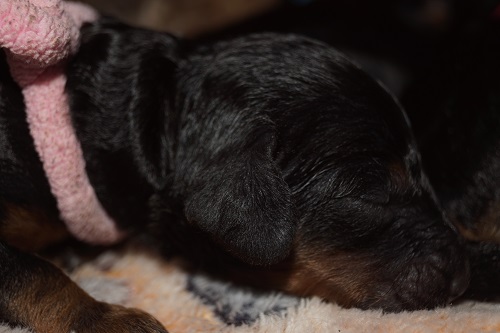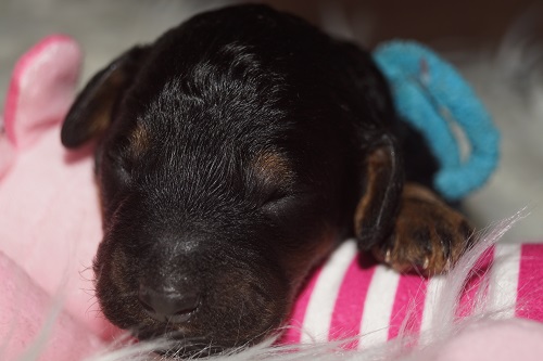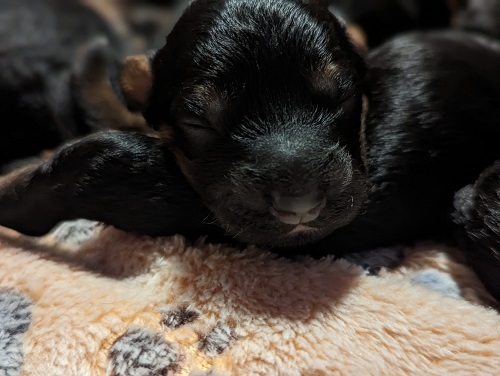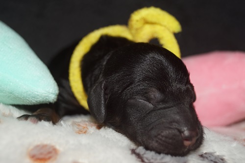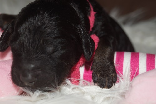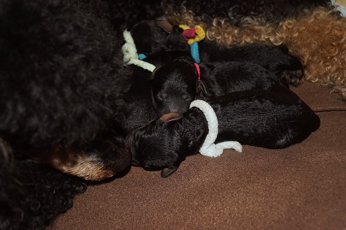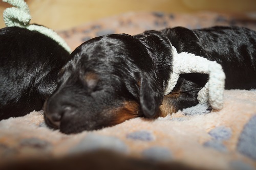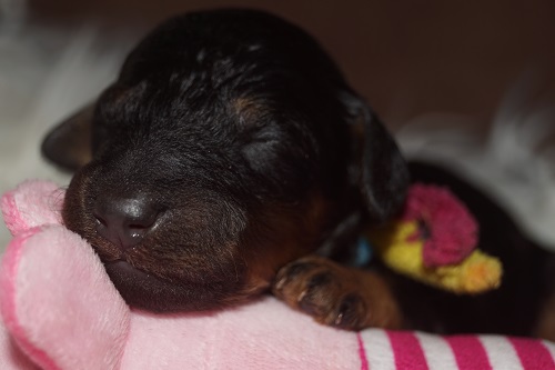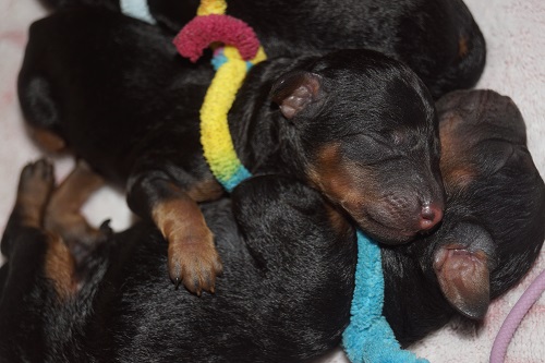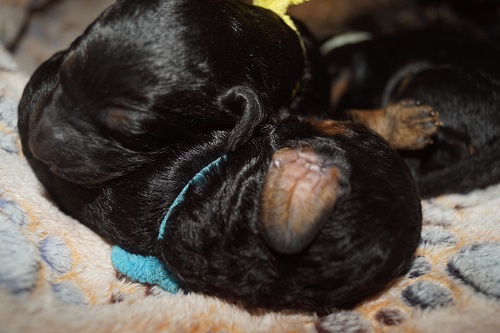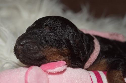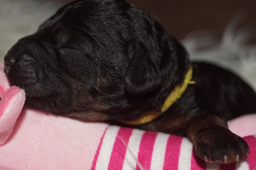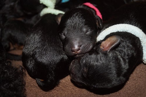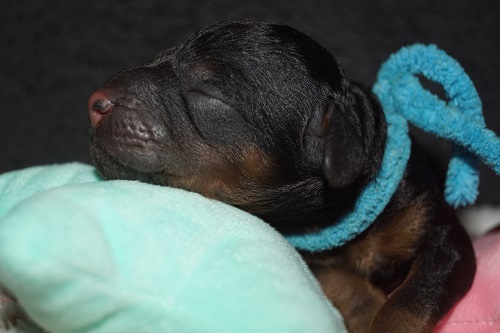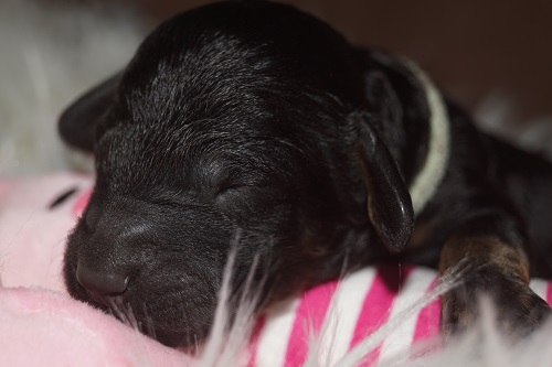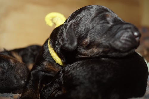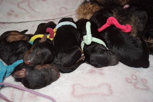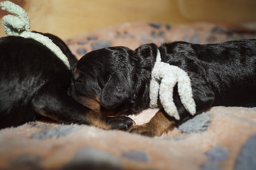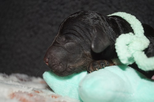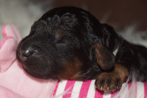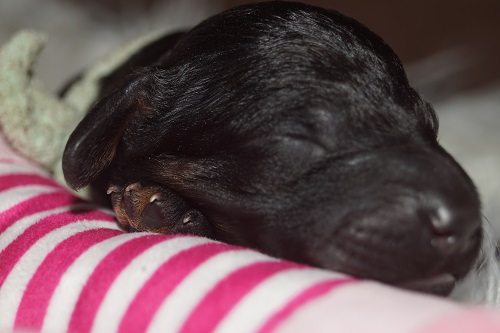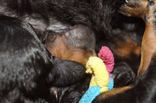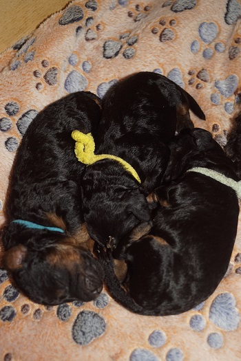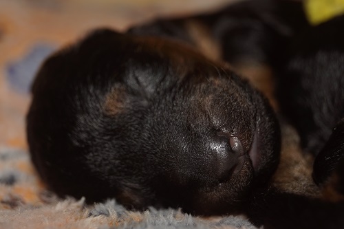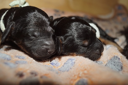 Heute vor einer Woche wurden wir geboren und wir glauben unsere Mama Sunny ist die betse Mama der Welt . Von der ersten Minute an ist sie stets damit beschäftigt uns zu hegen und zu pflegen und reichlich mit Milch zu versorgen. Unsere Gewichte gehen Tag für Tag steil nach und wir geniessen es eng aneinander bei unserer Mama zu schlafen. Oma Socke und Uropa Casimir werfen auch schon mal einen Blick in unsere Welpenstube.