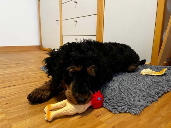 Lustig ist er er will alles erkunden und schleppt alles in seine Ecken wie Gummischlappen Leine Tennisball
